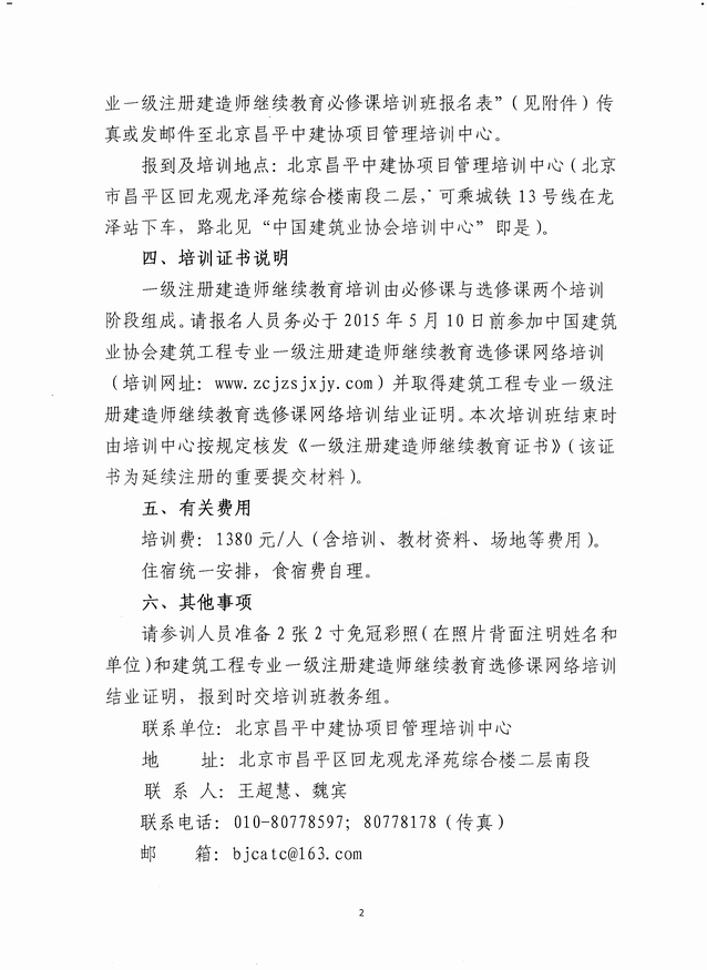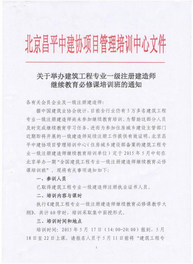 为帮助尚未参加继续教育培训的一级注册建造师完成学习任务,为即将开展的一级建造师延续注册工作提供有效证明,北京昌平中建协项目管理培训中心定于2015年5月中旬在北京举办一期“全国建筑工程专业一级注册建造师继续教育必修课培训班”。现将通知转发给你们,有需要的企业和个人请于5月11日前将报名表发传真或邮件至北京昌平中建协项目管理培训中心。