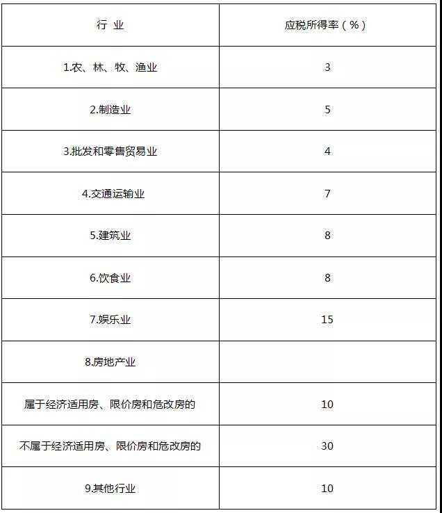 本公告根据不同的行业,在《国家税务总局关于印发<企业所得税核定征收办法(试行)>的通知》(国税发〔2008〕30号)第八条规定的幅度内,对房地产业按最高的标准确定应税所得率,对房地产业以外的行业按最低标准确定应税所得率。