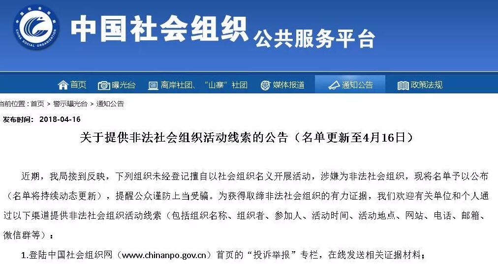 4月16日,民政部公布了307家涉嫌非法社会组织名单。