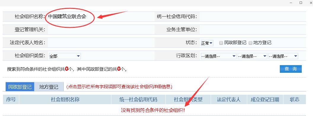 3、如上图示,如果是合法组织,会有登记记录,并有“统一社会信用代码”等信息;如是未经登记的非法组织,则无信息记录。