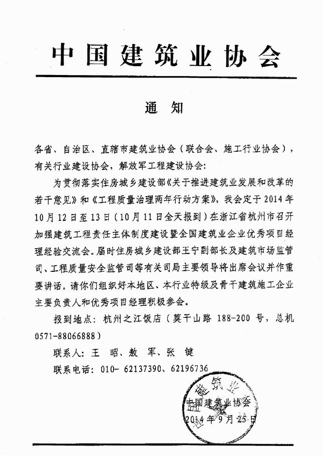 1、请各地区及有关行业建筑业(建设)协会积极协助组织本地区、本系统的优秀项目经理、全国建设工程优秀项目管理成果获奖人员和单位参加。由于本次会议规模大,人员多,为便于预约住房,请参会人员将回执于9月26日前传真至我会。
