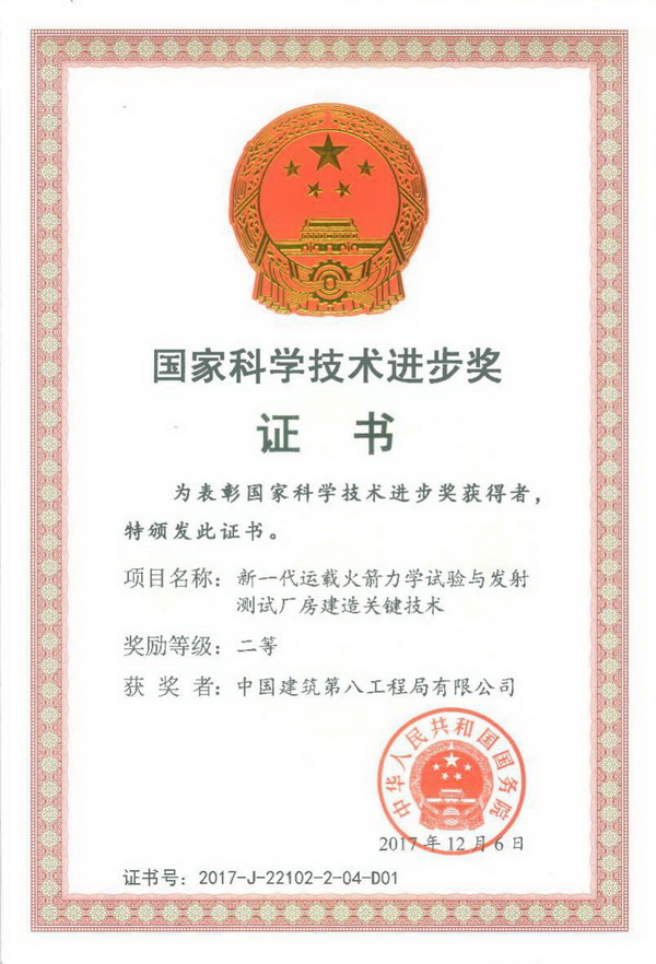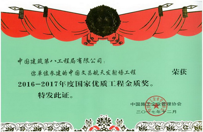 中建八局海南分公司以其承建的海南文昌垂直总装测试厂房为载体研究形成的“新一代运载火箭力学试验与发射测试厂房建造关键技术”获得国家科技进步二等奖,这也是海南建筑行业获得的第一个国家科技进步奖,《新一代运载火箭力学试验与发射测试厂房建造关键技术》项目针对我国自行设计建造的新一代火箭(5米/7米直径)力学试验及垂直总装测试厂房“高、重、精、特”(世界最高的单层混凝土结构,世界最重562吨平开钢大门,土木工程领域最高精度的预埋要求,火箭测试平台、81米高空吊车、大面积泄爆墙等特殊结构与设备)的特点开展研究,形成该领域中国独有的建造技术,为2016年长征7号/5号运载火箭的成功首飞提供了可靠设施保障,推动了我国航空航天建设领域的发展,促进了建筑行业的科技进步。12月份该工程还获得了中国施工企业协会颁发的2017年度国家优质工程金质奖。